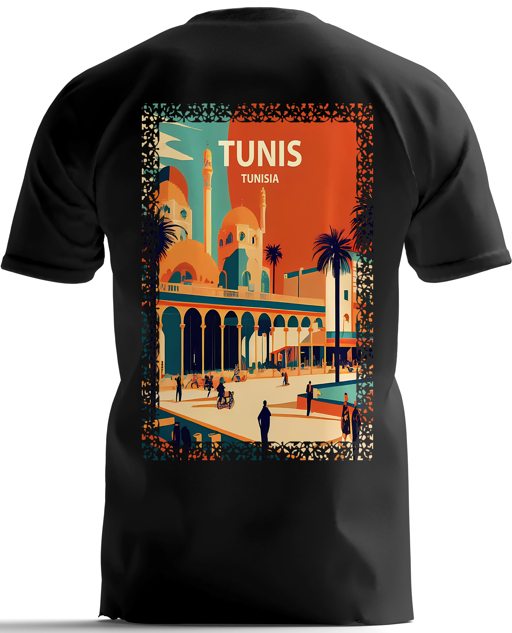 - Détails: La mention du nom « TUNIS » au-dessus du bâtiment renforce le thème du voyage et de la découverte. Les petits détails, comme les silhouettes de personnes au premier plan, ajoutent une échelle humaine et une sensation de vie à la scène.