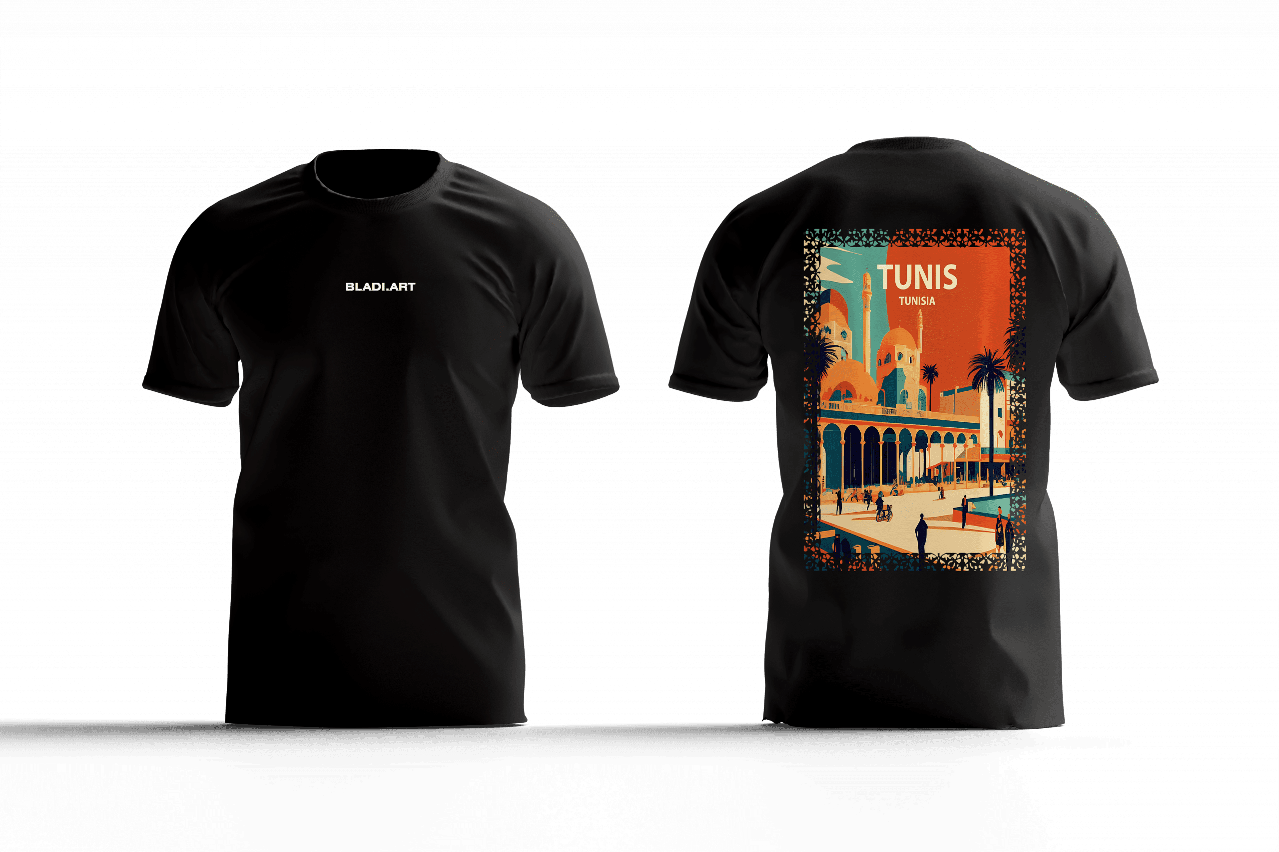 - Ce design saisissant est un hommage à Tunis, la capitale tunisienne. Il présente une vue artistique d’un bâtiment emblématique, probablement la mosquée Zitouna, avec ses coupoles distinctives et son architecture raffinée.